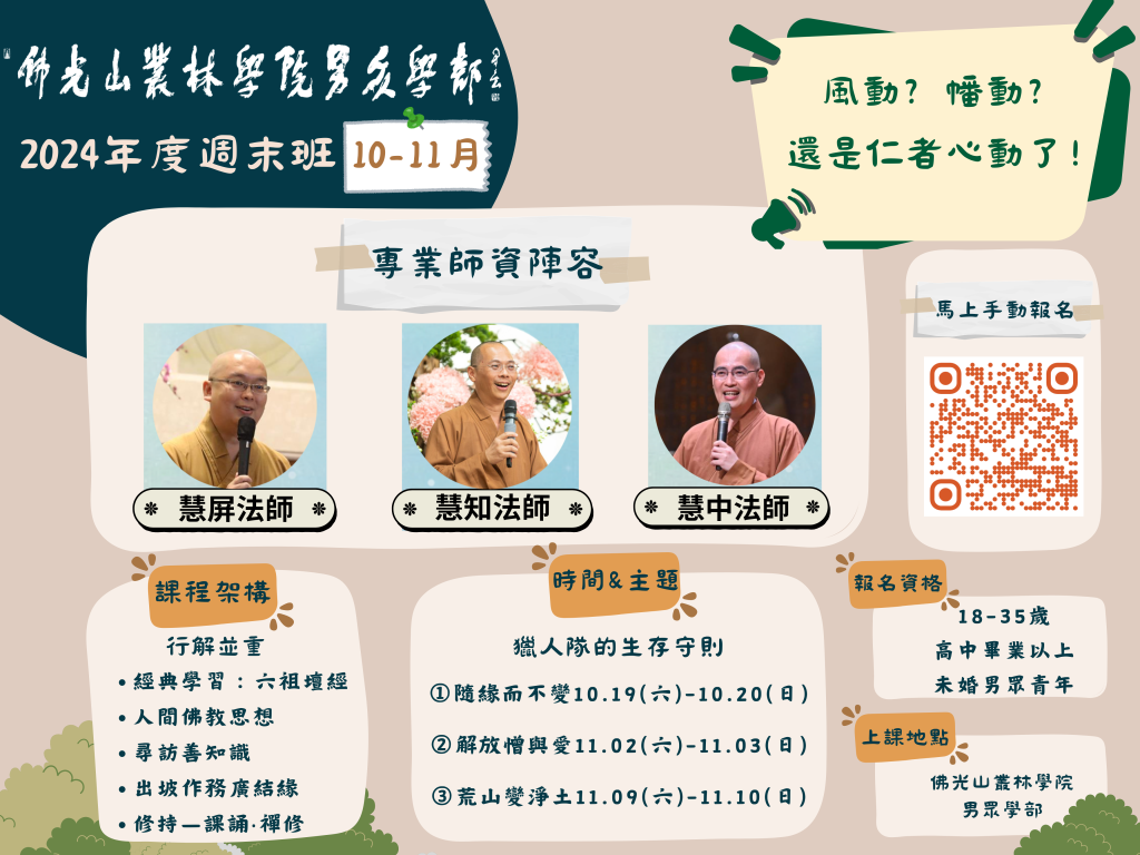 佛光山叢林學院男多學都2024年度週末班 10-11月 行解並重·經典學習:六祖壇經·人間佛教思想·尋訪善知識·出坡作務廣結緣·修持一課誦‧禪修 獵人隊的生存守則①隨緣而不變10.19(六)-10.20(日)②解放憎與愛11.02(六)-11.03(日)③荒山變淨土11.09(六)-11.10(日)
